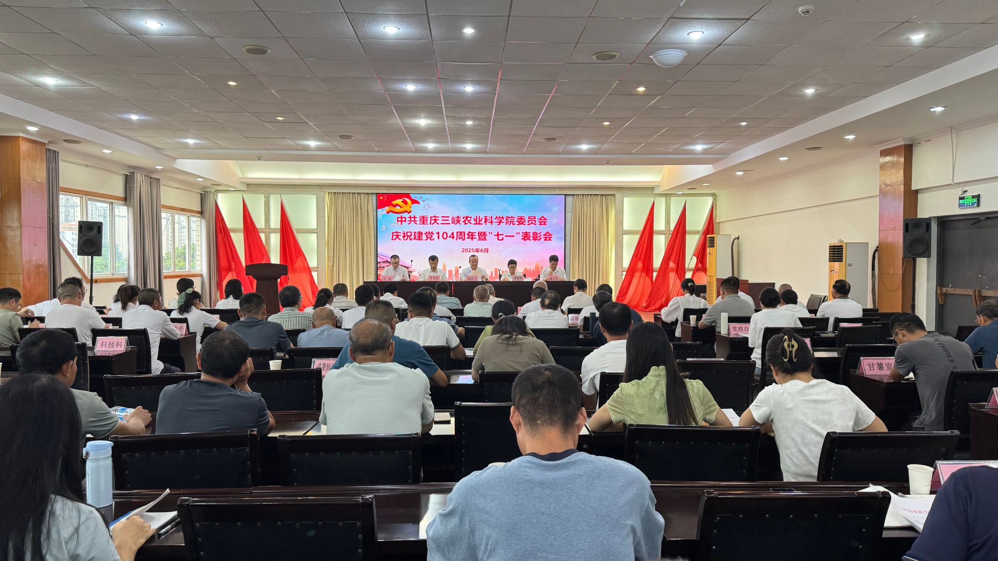 表彰会在慷慨激昂的国歌声中拉开帷幕。院党委委员、副院长李智念、戚文华同志,分别宣读了《中共重庆三峡农业科学院委员会关于表彰2024-2025年度“两优一先”的决定》《重庆三峡农业科学院关于表彰2024年度先进科室和优秀个人的决定》,院党委委员、纪委书记王航同志通报了学校关于“两优一先”表彰和领导班子、单位考核的情况。会上对涌现出的“先进基层党组织”粮油党支部、曾秀丽等8名“优秀共产党员”、刘忠贤等4名 “优秀党务工作者”及党政办等5个先进科室、晏庆九等20名 “优秀个人”、曾川等5名 “先进个人”进行了表彰。