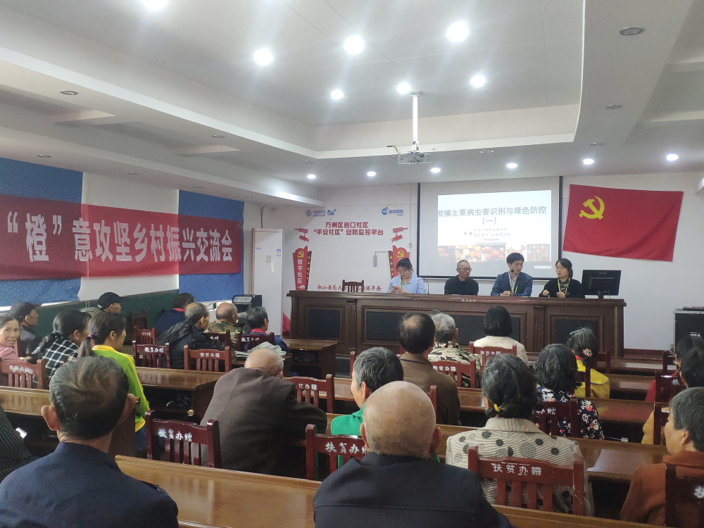 5月27日,9728太阳集团蚕桑研究所与三峡学院生工学院果树团队深入龙沙镇岩口社区,举办了玫瑰香橙病虫害防治和果园除草技术培训。参加培训的有当地农民,还有种植了2000亩玫瑰香橙的海普农业有限公司的管理人员和农民工人,他们冒着大雨早早来到社区办公室等候培训。蚕桑研究所副所长陈泉博士为果农讲解了玫瑰香橙当前病虫害防治技术,重点介绍了柑橘溃疡病的预防,并就沙皮病、疫霉褐腐病、青苔、白粉虱和大实蝇等当地果园发生较为严重的病虫害进行了针对性讲解。三峡学院生工学院戚文华教授准备了精美的PPT,采用大学老师的授课方式,循循善诱,深入浅出地为果农讲解了果园除草新技术,耳目一新的讲解让现场氛围达到高潮。通过图文并茂、亲手示范和答疑解惑等方式,现场受训人员踊跃提问,主动交流,纷纷表示收获满满。