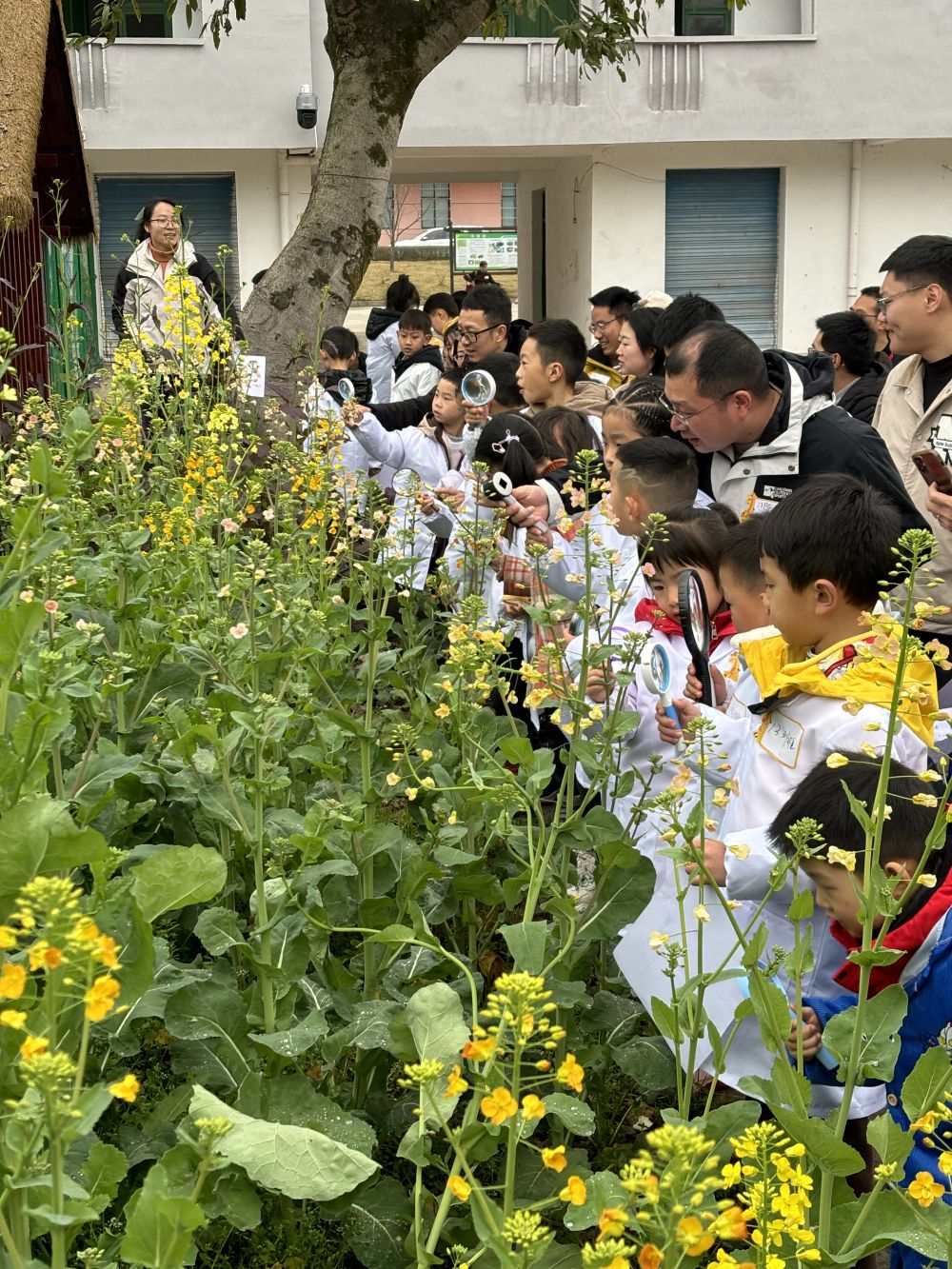 在科普讲解员带领下,孩子们有序进入科研试验田开展“田野调查”。通过比对观察不同油菜品系,他们学会了用放大镜辨识叶片齿状特征,用直尺测量茎秆高度,在科研记录本上认真标注“花色”“叶型”“第一次分枝数”等数据。