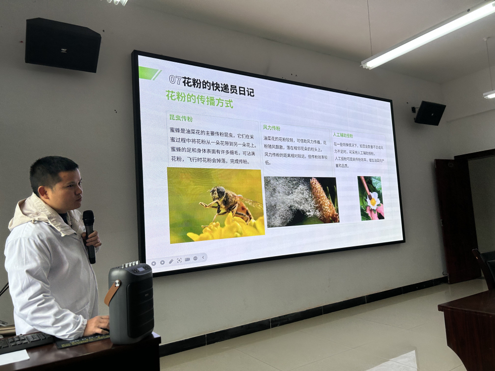 上午10时,科普讲解员曾川正高级农艺师以“探秘油菜”为主题,通过多媒体动画和实物标本,划分“油菜是谁”、“油菜的生长”、“油菜彩色家族”、“油菜的超能力”、“实验室里的双低油菜”五大板块,用通俗易懂的语言为孩子们上了一堂生动的科普课,揭开了油菜的奥秘。“小科学家们”了解到油菜不仅是中国传统"小春"作物,更是支撑粮油安全的重要战略资源。互动环节中,孩子们踊跃提问:“油菜花为什么是黄色?”“彩色油菜花是怎么变出来的?”等问题引得现场笑声连连。