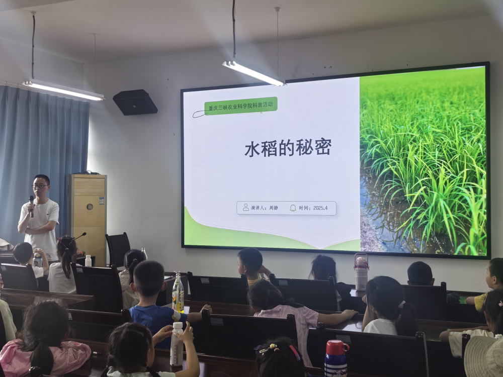 在科普讲堂中,成果转化中心副主任周静以生动语言为孩子们揭开水稻的奥秘。从“水稻是谁”到“水稻的成长”,再到“水稻分类与超能力”,周静详细介绍了籼稻、粳稻及杂交稻的特性,让孩子们对水稻有了更深入的了解。